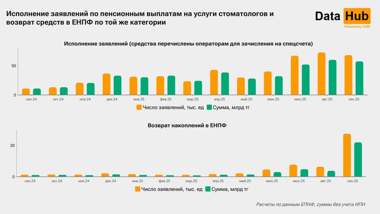 По итогам месяца количество заявлений на стоматологию снизилось незначительно — на 6% по количеству и на 4% по сумме (до 67,5 тыс. заявлений на 56,9 млрд тенге). Однако при этом резко вырос объём возвратов средств обратно в ЕНПФ — 21,8 млрд тенге по 27,3 тыс. заявлений, что почти в шесть раз больше, чем в августе.