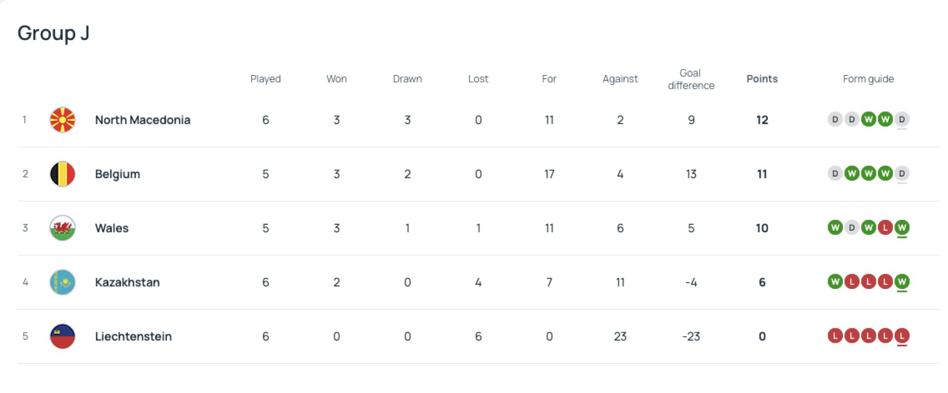 Сборная Северной Македонии, в свою очередь, лидирует в группе с 12 очками, а в последнем туре сенсационно сыграла вничью с Бельгией (0:0) на выезде.