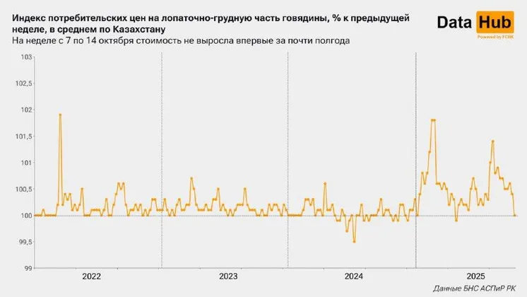 В период с 7 по 14 октября цены на лопаточно-грудную часть в среднем по РК не изменились, следует из статистики БНС АСПиР РК по социально значимым продовольственным товарам. До того цены росли 23 недели подряд, с начала мая, передает DataHub.