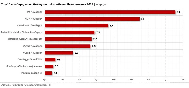 Самым прибыльным стал «М-Ломбард»: 7,6 млрд тг за январь–июнь текущего года. Следом идёт «МК-Ломбард»: 5,5 млрд тг. Существенную прибыль показали также «мк-Золото Ломбард» (3,7 млрд тг), Birinshi Lombard (2,9 млрд тг), ломбард «Деньги населению» (2,7 млрд тг), «Астра-Ломбард» (2,6 млрд тг) и «Сейф-Ломбард» (1,6 млрд тг). Только у этих семи ломбардов прибыль была более 1 млрд тг.