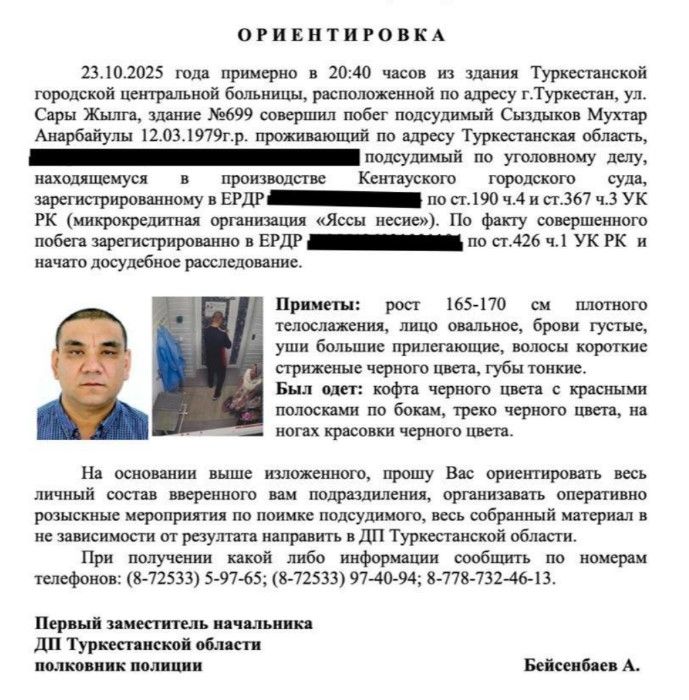 В Туркестанской области полицейские разыскивают подсудимого, который самовольно покинул медицинское учреждение, где проходил лечение.