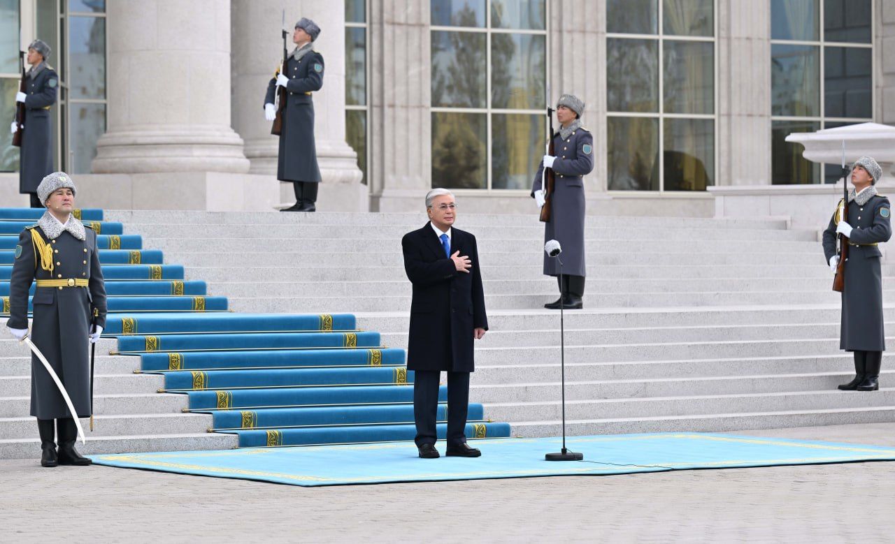 На площади перед резиденцией Акорда с участием главы государства Касым-Жомарта Токаева состоялась торжественная церемония поднятия Государственного флага, приуроченная ко Дню Республики и 35-летию Декларации о государственном суверенитете Казахстана.