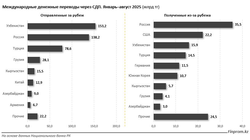 За январь–август 2025 года из Казахстана через системы денежных переводов (СДП) отправлено 464,3 млрд тенге, что на 14,4% меньше, чем за тот же период 2024 года.