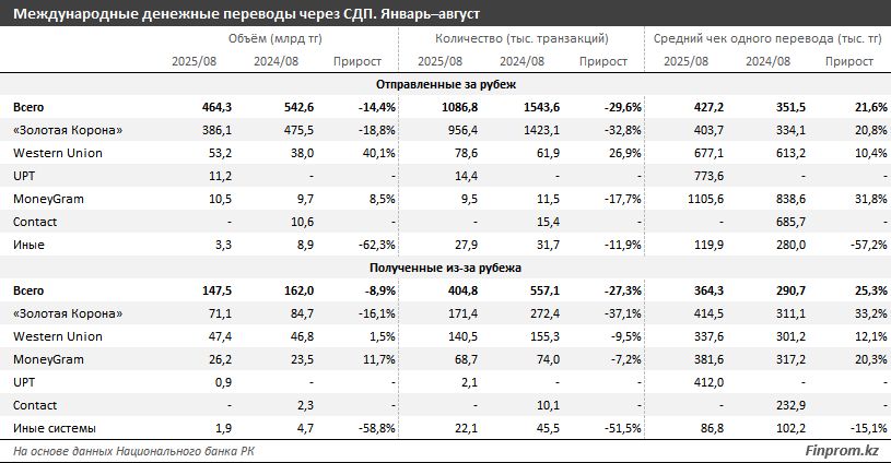 MoneyGram — 10,5 млрд тг (+8,5%), средний чек — 1,1 млн тг (+31,8%).