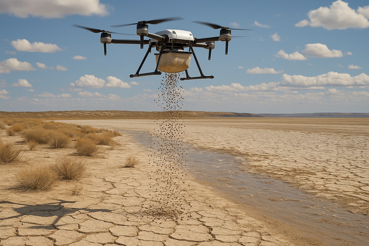 Это система аэросева с помощью дронов, которые рассеивают самозаглубляющиеся семена в биоразлагаемом материале.
