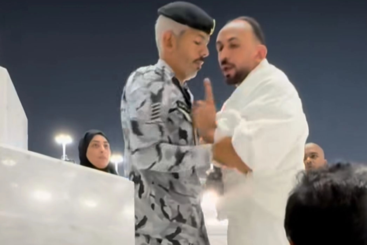 На кадрах видно, как мужчина в форме подходит к женщине в хиджабе, грубо берёт её за руку и пытается поднять. Затем он обращается к мужчине, также пытаясь вытолкнуть его с места. Сцена сопровождается повышенными голосами, но никто из окружающих не вмешивается — паломники лишь наблюдают за происходящим.