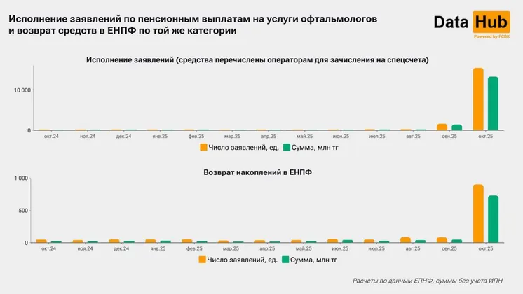 Для сравнения: к 1 сентября общее количество заявлений на лечение глаз за всё время было близко к результату только одного октября (15,5 тыс. заявлений), а накопительная сумма тогда не превышала 8,8 млрд тенге.