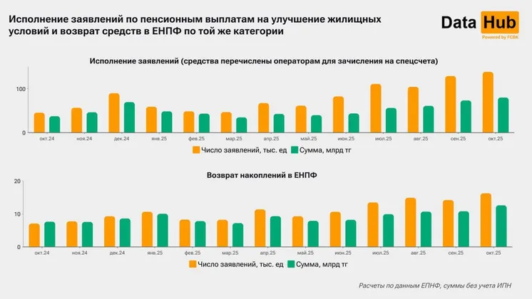 Тем временем, выплаты на улучшение жилищных условий продолжают расти стабильно. В октябре было 138,4 тыс. исполненных заявлений (+7%) на сумму 79,9 млрд тенге (+9%). Возврат средств по этой категории составил 16,3 тыс. заявлений и 12,6 млрд тенге, что соответствует средним значениям предыдущих месяцев.