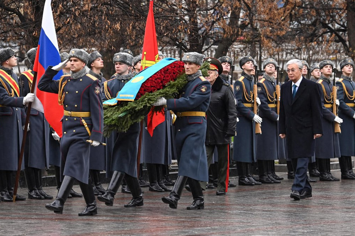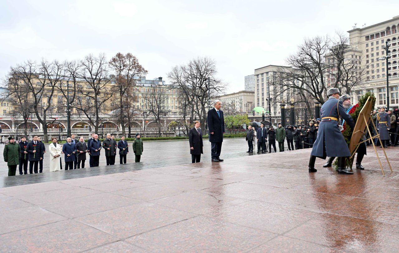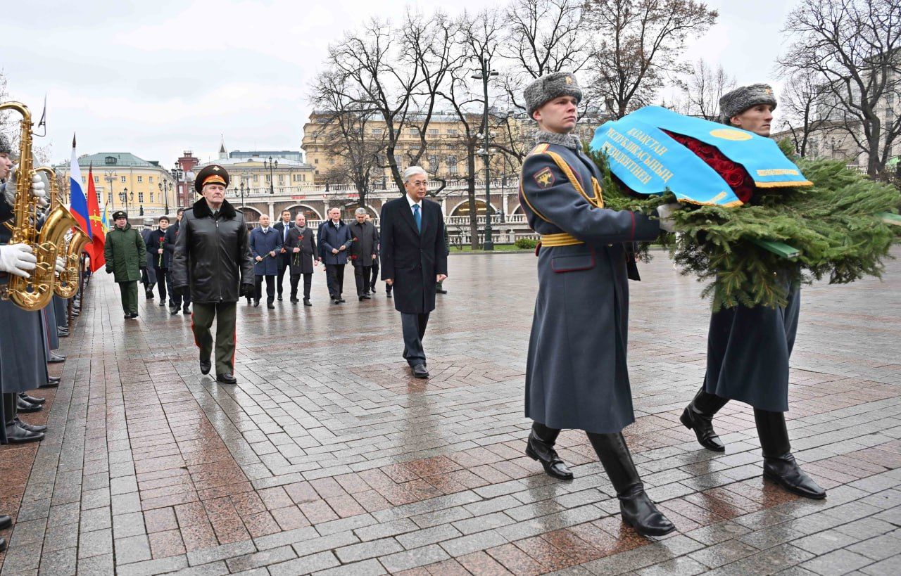 Второй день государственного визита Президента Республики Казахстан Касым-Жомарта Токаева в Российскую Федерацию начался с церемонии возложения цветов к мемориалу «Могила неизвестного солдата» в Александровском саду.