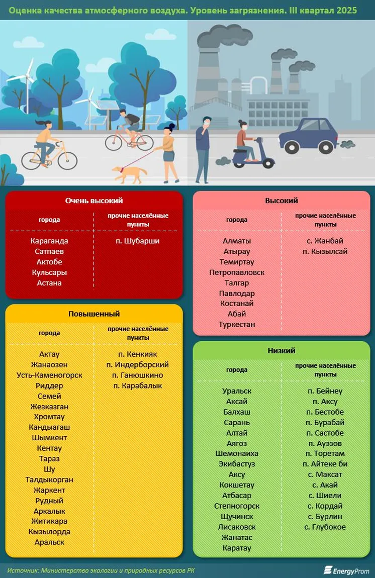 По данным министерства экологии и природных ресурсов Республики Казахстан за третий квартал 2025 года, Атырау и Кульсары оказались среди территорий с наиболее высокой степенью загрязнения воздуха.