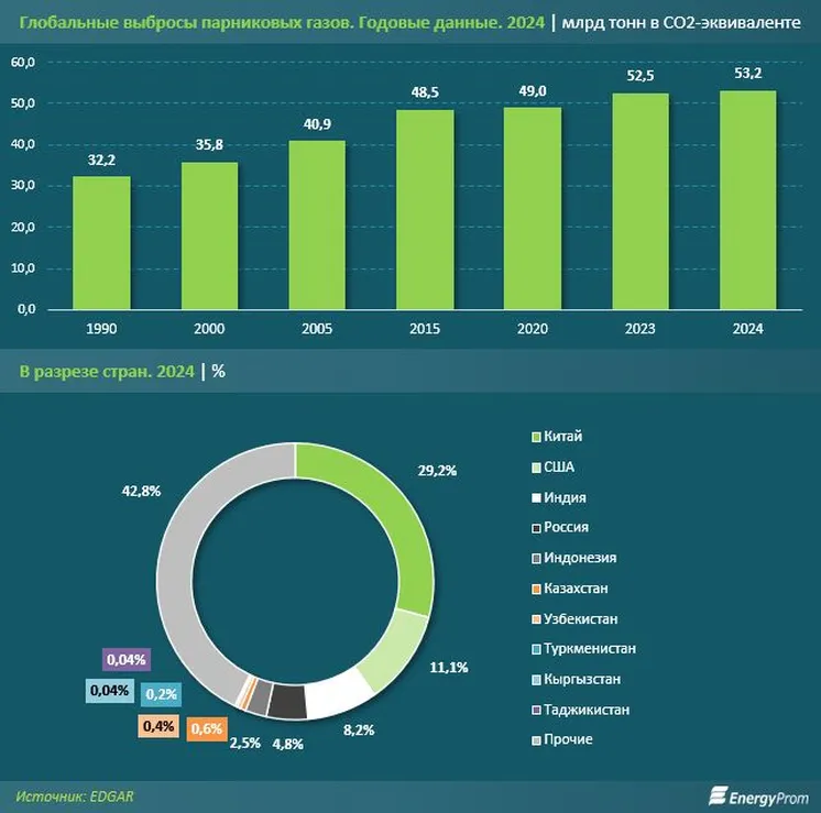 По данным EDGAR, глобальные выбросы парниковых газов в 2024 году достигли 53,2 млрд тонн CO₂-эквивалента, что на 1,3% выше показателя 2023 года.