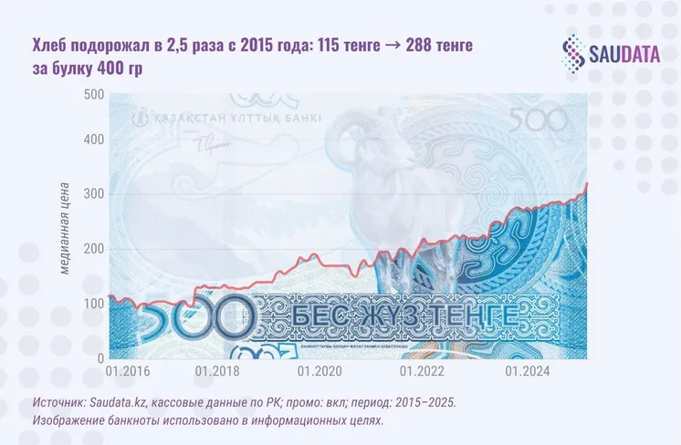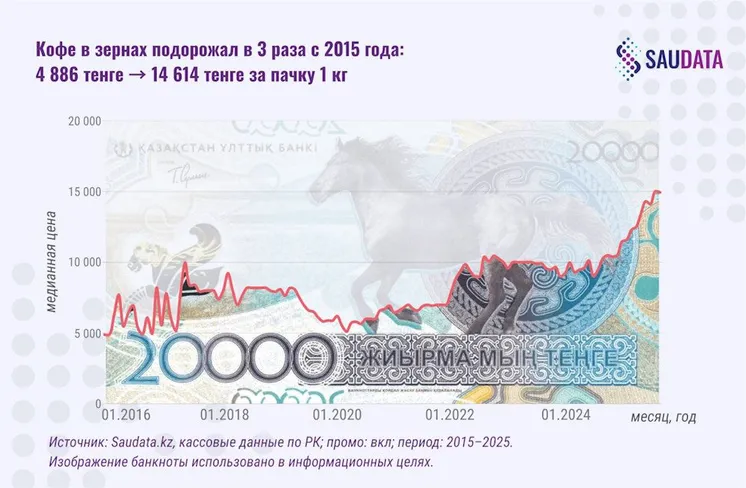 Одновременно стоимость стандартной 400-граммовой булки хлеба выросла в 2,5 раза (со 115 до 288 тенге), а килограмма кофе в зернах – в 3 раза (с 4 886 до 14 614 тенге).