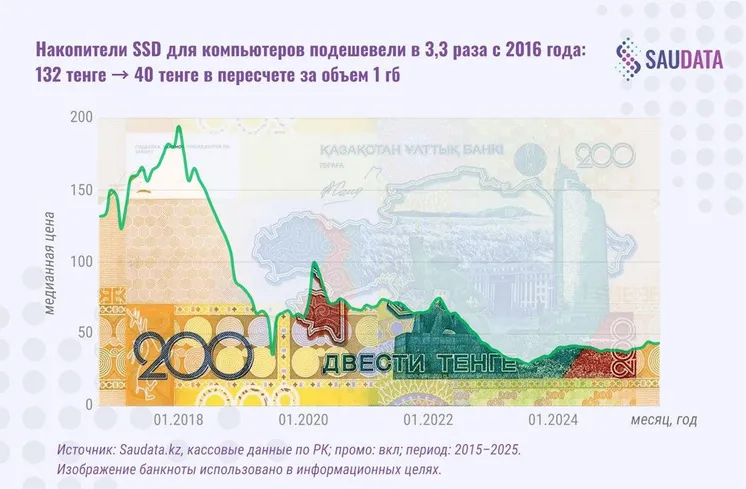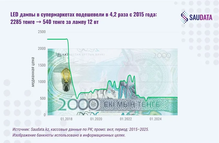 Для ценового сравнения различных видов продукции были выбраны ключевые параметры того или иного товара (единицы пользы), которые, собственно, и оплачиваются покупателем на кассе – штука/килограмм/литр/гигабайт. При применении такого подхода выяснилось, что стоимость ряда технологичных товаров за последние 10 лет стала меньше – в частности, стоимость 1 гигабайта в SSD-накопителях снизилась в 3,3 раза, со 132 до 40 тенге, а средняя стоимость LED-ламп мощностью 12 Вт уменьшилась в 4,2 раза, с 2 285 до 540 тенге.
