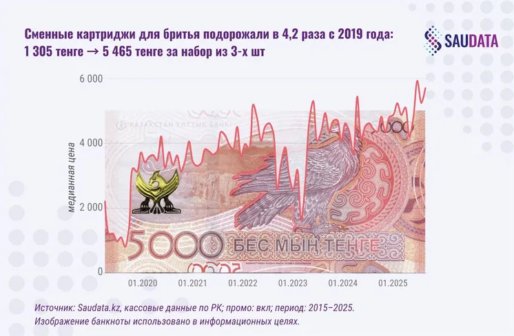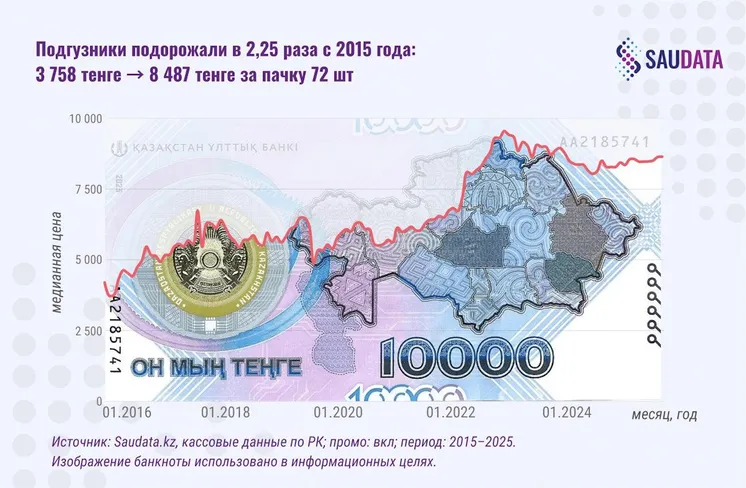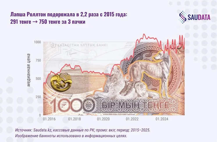 Три пачки лапши "Роллтон" обходятся покупателю теперь в 2,2 раза дороже, чем 10 лет назад (291 и 750 тенге соответственно), упаковка подгузников (72 штуки) подорожала за это время в 2,25 раза (с 3 758 до 8 487 тенге), набор картриджей для бритья (3 штуки) вырос в цене в 4,2 раза (1 305 и 5 465 тенге соответственно).