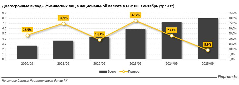 По данным на 1 октября 2025 года, сумма таких депозитов в банках второго уровня достигла 8 трлн тенге, что на 8,9% больше, чем годом ранее. За последние пять лет показатель вырос почти в три раза.