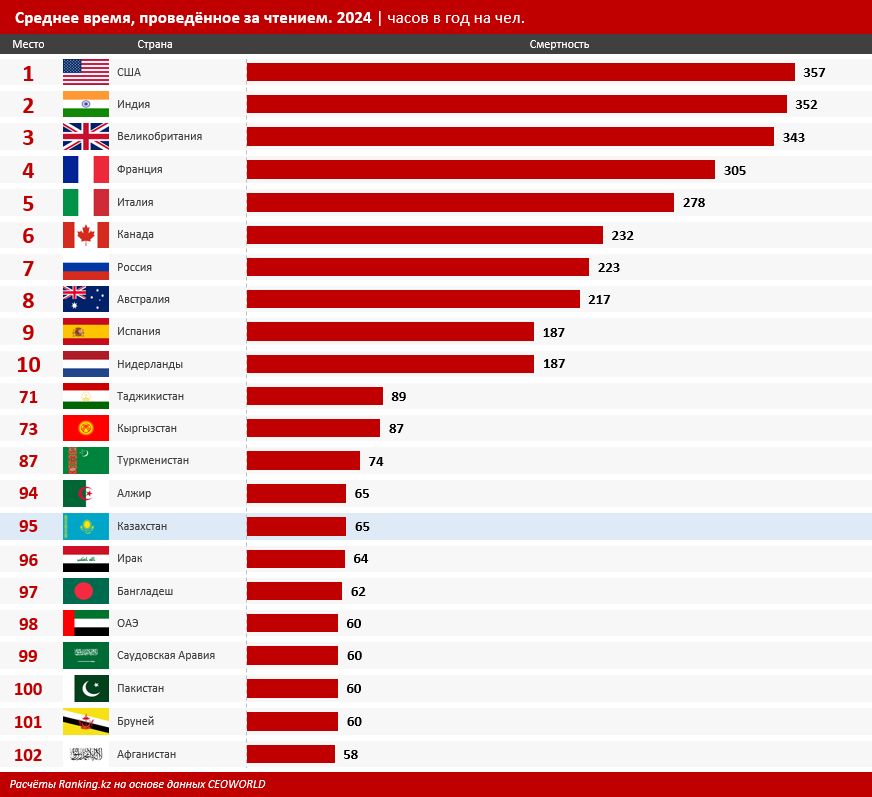 Согласно опросу бизнес-издания CEOWORLD, у которого более 12,4 млн читателей по всему миру, Казахстан — далеко не читающая страна: в рейтинге за 2024 год он занял 95-е место среди 102 государств, в которых суммарно было опрошено 6,5 млн человек, передает ranking.kz.