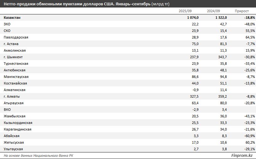 Анализируя динамику с начала года, эксперты отмечают, что за январь–сентябрь 2025‑го объём «чистых» продаж долларов через обменные пункты достиг 1,1 трлн тенге. Такой результат стал минимальным за аналогичный период с 2018 года. В годовом выражении сокращение объёма продаж составило 18,8 %.