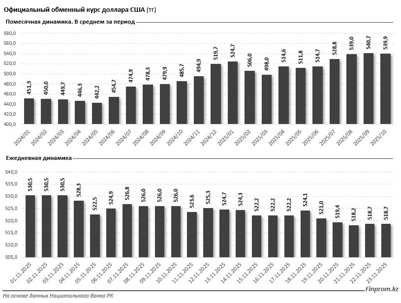 Что касается динамики курса, то в октябре 2025 года средний официальный курс доллара США составил 539,9 тенге — лишь на 0,2 % ниже сентябрьского показателя. В годовом выражении (по сравнению с октябрём 2024 года) курс вырос на 11,2 %. В ноябре доллар начал торги на отметке 530,5 тенге, а к 23 ноября снизился на 2,2 %, до 518,7 тенге.