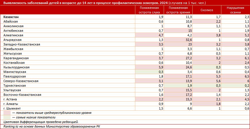 Самые низкие показатели — в Жамбылской и Алматинской областях. Однако аналитики предполагают, что это может быть связано не с лучшим здоровьем, а с трудностями доступа к медосмотрам для сельских детей.