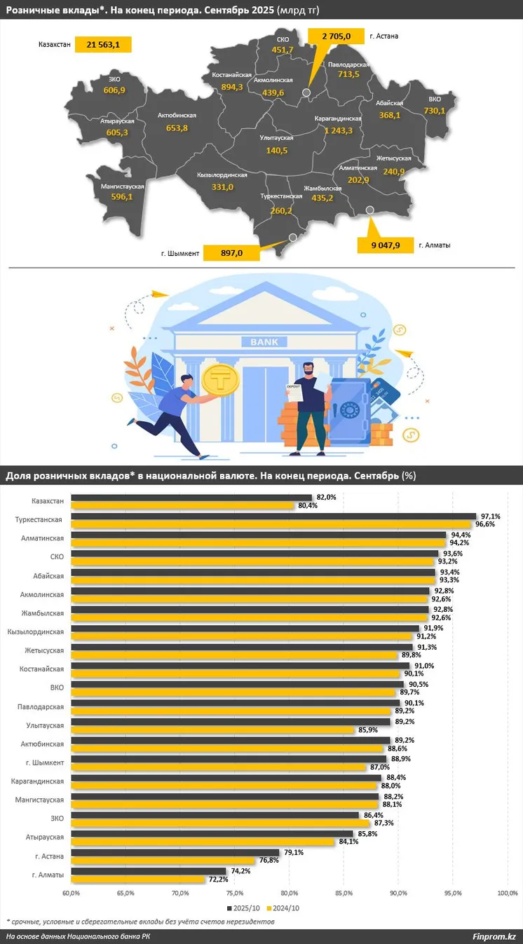 Общий объём розничных вкладов (срочные, условные и сберегательные депозиты без учёта счетов нерезидентов) вырос на 19,9%, до 21,6 трлн тенге. При этом депозиты в тенге увеличились на 22,4%, достигнув 17,7 трлн тенге, тогда как валютные — на 9,5%, до 3,9 трлн тенге.