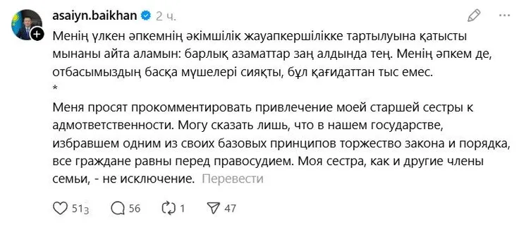 Асаи Байханов прокомментировал ситуацию у себя в Threads: