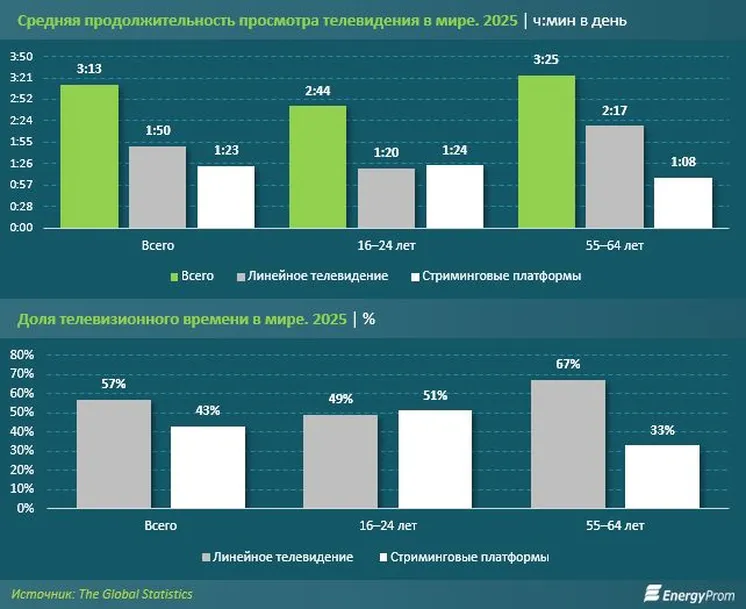 - суммарное время просмотра — 3 часа 25 минут (на 25 % больше, чем у молодёжи).