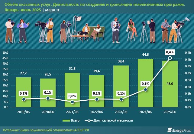 - Объём услуг по созданию и трансляции телепрограмм (январь–июнь 2025 г.) — 43 млрд тенге. Это на 3,6 % меньше, чем за аналогичный период 2024 года, когда наблюдался рост на 16,2 %.