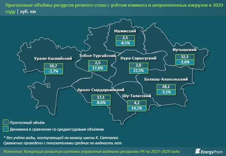 Казахстанские эксперты в сфере водных ресурсов также прогнозируют дальнейшее сокращение речного стока со стороны других государств. В Концепции развития систему управления водными ресурсами РК на 2023–2029 годы говорится, что в течение ближайших четырёх лет внутренний речной сток в Казахстане сократится со 102,3 до 99,4 куб. км, то есть на 2,9%. Это произойдёт за счёт уменьшения притока воды в реках со стороны сопредельных государств на 9,7%. Так, суммарный сток рек Арало-Сырдарьинского бассейна может сократиться на 8,6%, Иртышского – на 3,6%, Балхаш-Алакольского – на 3,1%, Ишимского – на 8,5%.