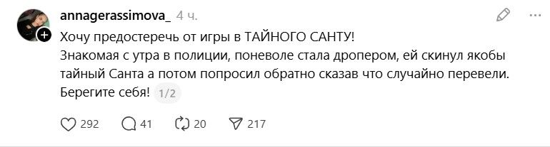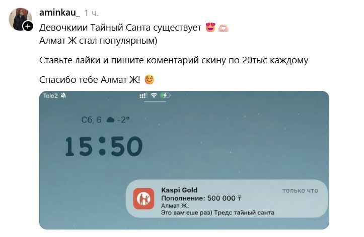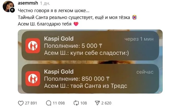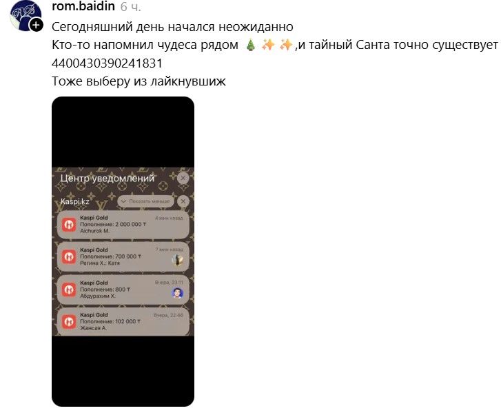 В казахстанском сегменте Threads стремительно распространяется тренд «Тайный Санта»: пользователи публикуют свои номера карт и телефонов, рассчитывая получить денежные переводы от незнакомцев.