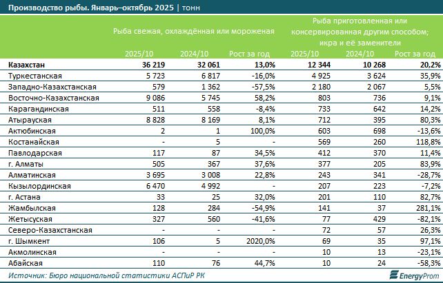 За январь–октябрь текущего года в стране произвели 36,2 тыс. тонн свежей, охлаждённой или мороженой рыбы — на 13% больше, чем за аналогичный период 2024-го, передает energyprom.kz.