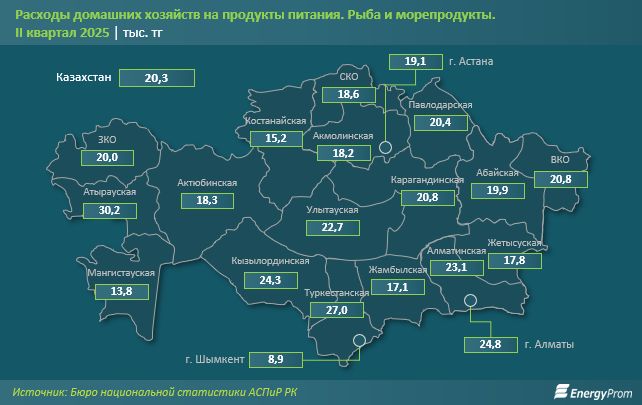 Расходы домашних хозяйств на рыбу и морепродукты во втором квартале текущего года составили 20,3 тыс. тг — на 8,4% больше, чем в аналогичном периоде 2024-го.