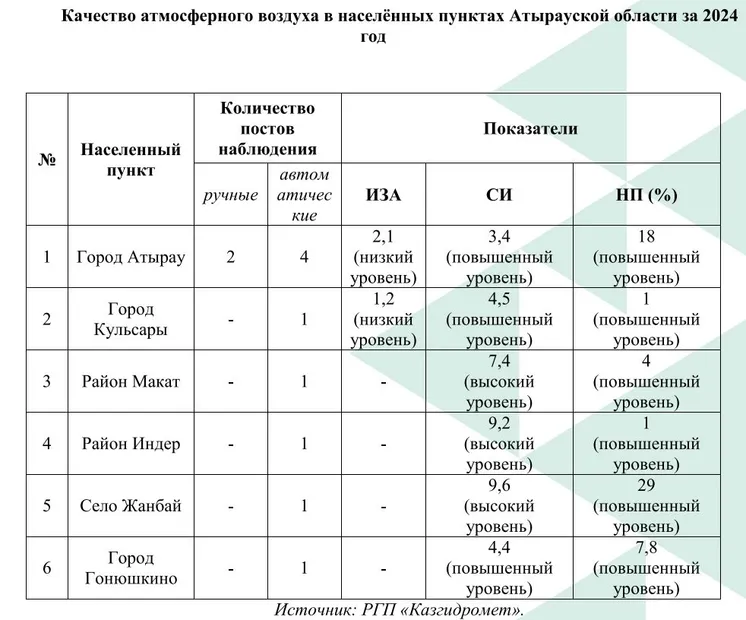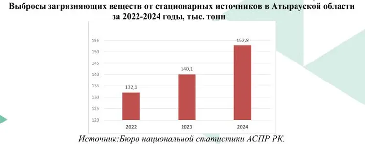 По информации департамента экологии Атырауской области основными источниками загрязнения в г. Атырау являются объекты нефтепереработки и транспортировки: АНПЗ, Тенгизшевройл, NCOC, Атырауская ТЭЦ, Эмбамунайгаз, ТОО «West Dala». По данным Бюро национальной статистики, в 2024 году объем выбросов загрязняющих веществ в атмосферу от стационарных источников составил 152,8 тысяч тонн.