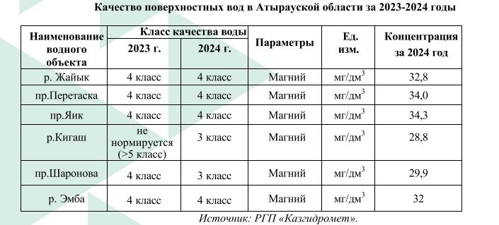 Как видно из таблицы, в сравнении с 2023 годом качество поверхностных вод реки Кигаш с «выше 5 класса» перешло в 3 класс, протоки Шаронова - с 4 класса перешло в третий (улучшилось). Качество поверхностных вод рек Жайык, Эмба, протоков Перетаска и Яик осталось без изменений.