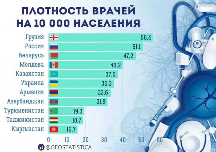 Лидером по плотности врачей является Грузия — 56,4 врача на 10 тысяч населения. Далее следуют Россия (51,1), Беларусь (47,2) и Молдова (40,2). Казахстан также входит в группу стран с показателем выше среднемирового — 37,5 врача на 10 тысяч человек.