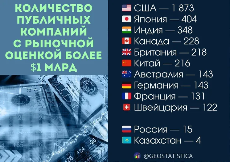 Среди стран СНГ в рейтинг попали Россия и Казахстан. В России насчитывается 15 публичных компаний с капитализацией свыше $1 млрд, в Казахстане — 4.