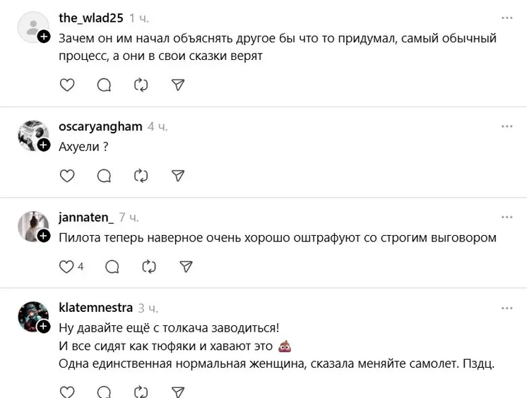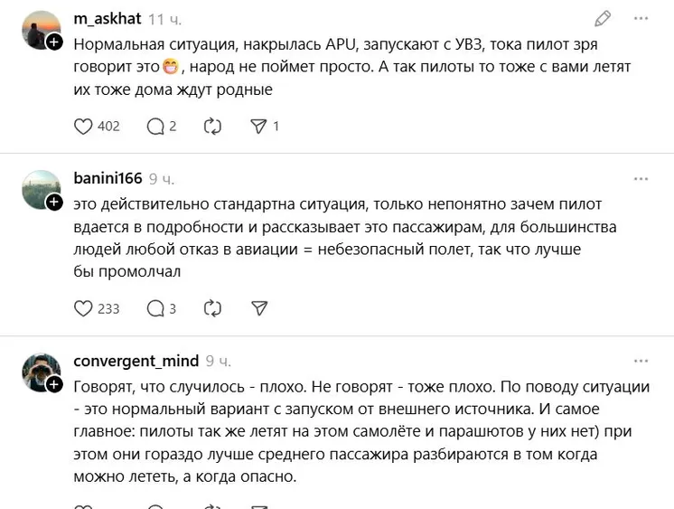 Мнения пользователей соцсетей разделились. Часть комментаторов сочла ситуацию штатной для авиации и поддержала действия экипажа, указав, что подобные отказы допустимы в рамках регламентов.