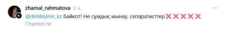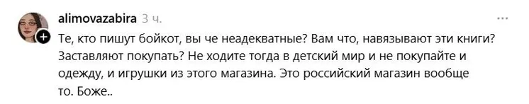 В то же время другая часть пользователей сочла подобную литературу недопустимой для продажи в Казахстане. По их мнению, книги могут носить пропагандистский характер и ассоциироваться с текущей войной в Украине. В комментариях звучали призывы к бойкоту магазинов сети «Детский мир» и требования убрать подобную продукцию с полок.