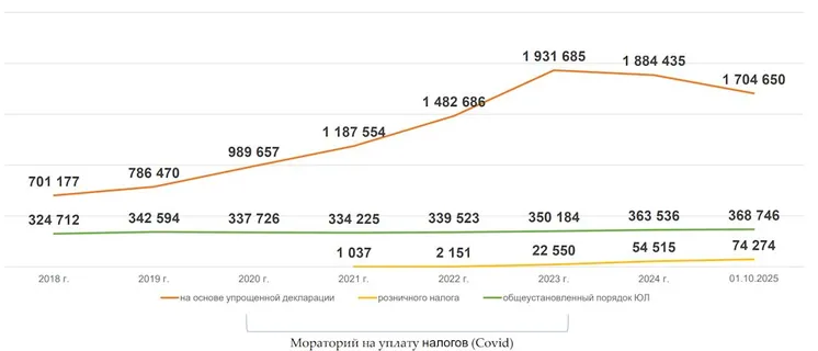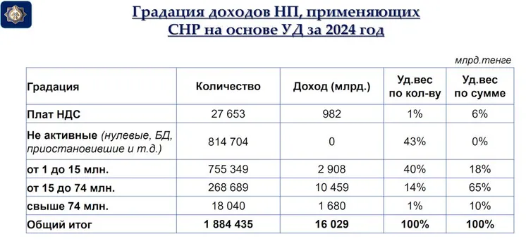 Нуржанов также отметил, что резкий рост налогоплательщиков, применяющих СНР УД, начался после пандемии коронавируса. Тогда малый бизнес освободили от налогов на 3 года и запретили в его отношении проверки. Так, их количество достигло пика в 1 931 685 в 2023 году.