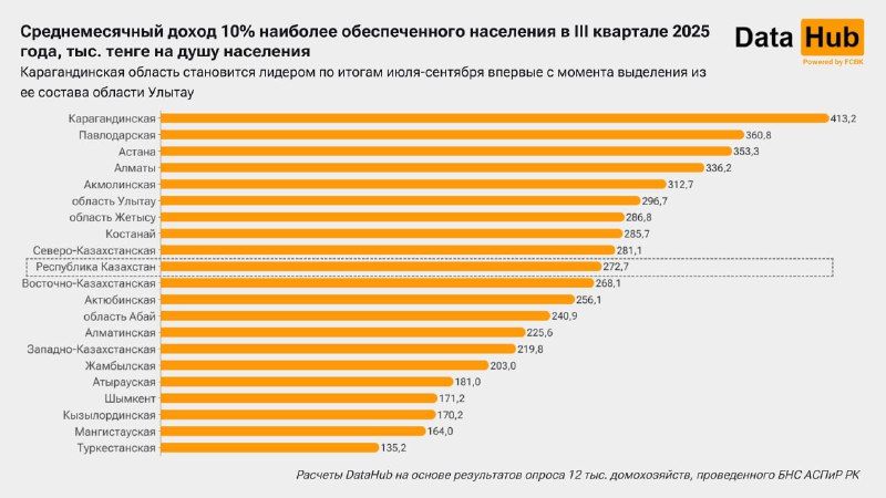 По итогам III квартала 10% наиболее обеспеченных жителей Карагандинской области располагали среднемесячным доходом в 413,2 тыс. тенге на душу населения. Это в 1,5 раза выше, чем средний показатель по стране, который составил 272,7 тыс. тенге. Ни в одном другом регионе Казахстана уровень доходов в этой группе не достигал столь высокого значения, свидетельствуют данные Бюро национальной статистики Агентства по стратегическому планированию и реформам РК, передает Data Hub.