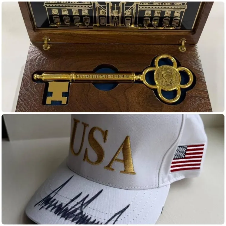 Кроме того, Президент США направил Главе государства несколько памятных подарков. Среди них — символический ключ от Белый дом и бейсболка с личным автографом Дональда Трампа.