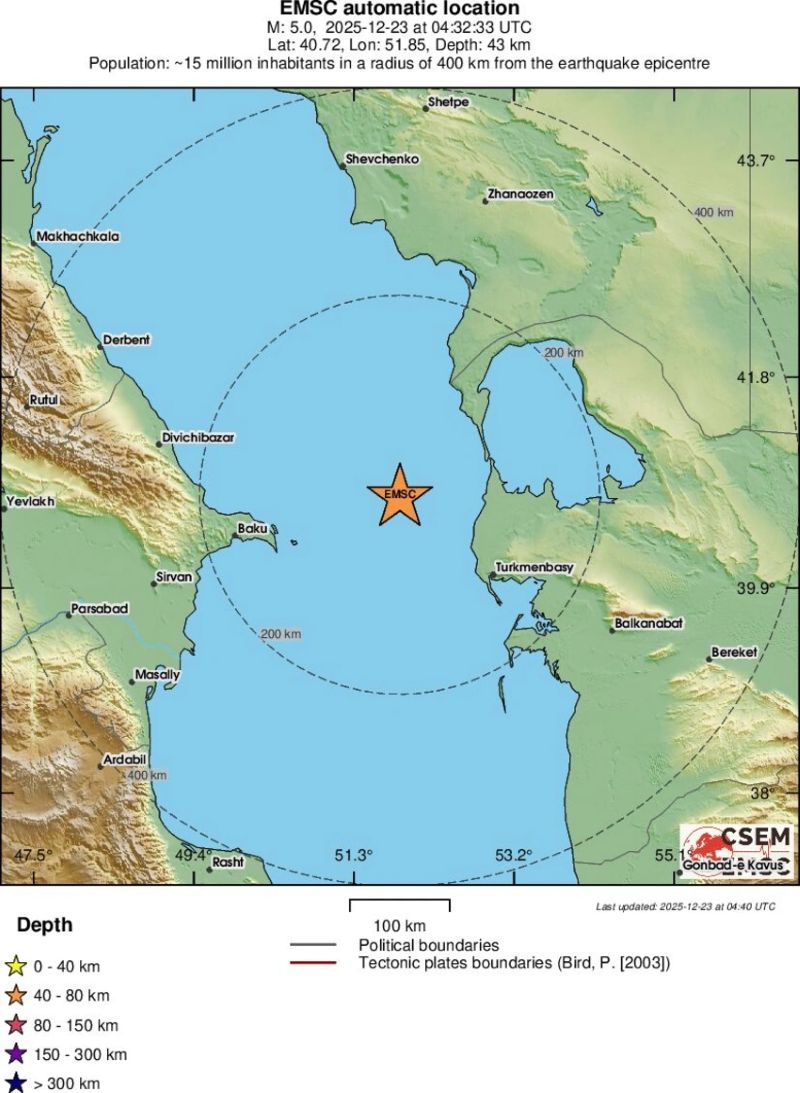 Согласно информации, подземные толчки были зафиксированы в 09:32 по времени Атырау в 132 км к северо-западу от города Туркменбаши. Очаг землетрясения залегал на глубине 43 км.
