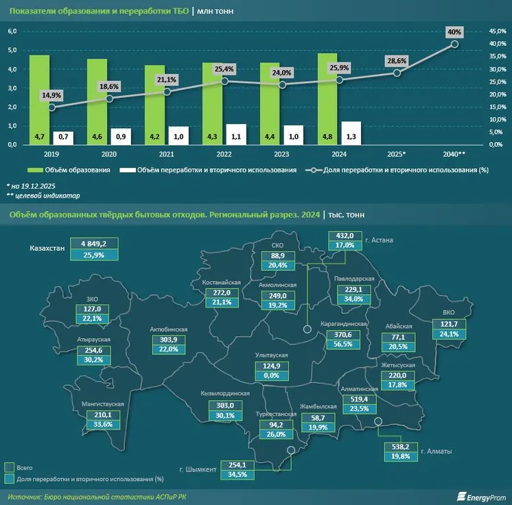 Пока предлагаем посмотреть, насколько за последние годы Казахстан продвинулся в вопросе переработки ТБО. По данным Бюро национальной статистики (БНС) АСПиР РК, каждый год в стране образуется от 4,2 млн до 4,8 млн тонн твёрдых бытовых отходов. С 2022-го ежегодные показатели планомерно росли, достигнув максимума в прошлом году. Из 4,8 млн тонн в 2024-м объём переработанных и вторично использованных отходов составил 1,3 млн тонн, то есть больше четверти. Перед Министерством экологии и природных ресурсов РК стоит цель к 2040 году довести это значение до 40%.
