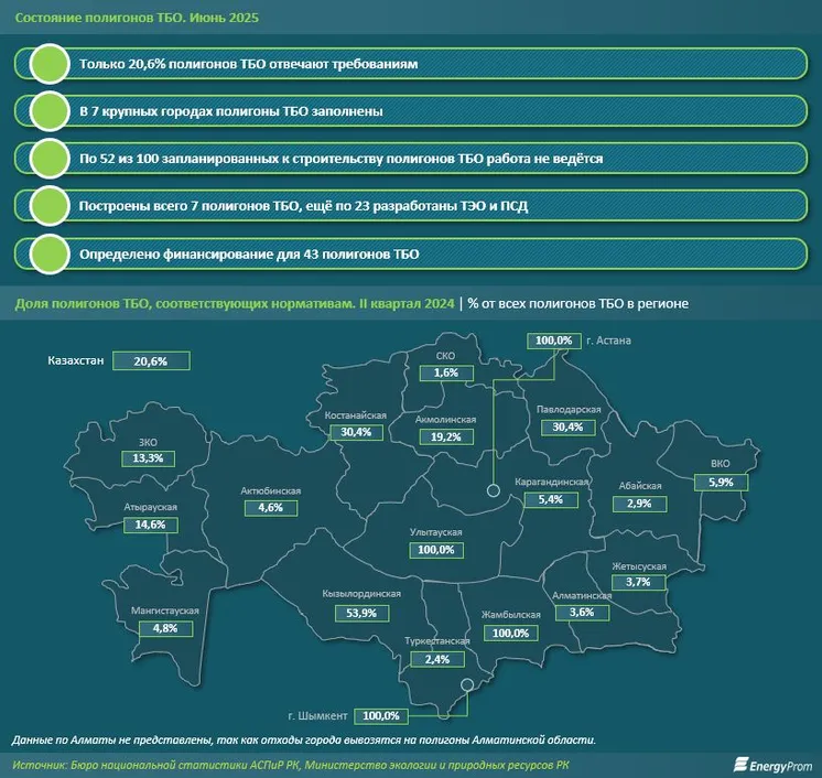 В целом ситуация с накоплением ТБО в Казахстане далеко не оптимистична. По данным БНС, накоплено уже 48,3 млн тонн отходов. В стране действуют около 3 тыс. мусорных полигонов, и лишь 20,6% из них соответствуют всем необходимым требованиям. Порядком в документации отличаются полигоны только в нескольких регионах — в Жамбылской и Улытауской областях, а также в Астане и Шымкенте. Наименьшие доли свалок, соответствующих требованиям, наблюдаются в Северо-Казахстанской (1,6%), Туркестанской (2,4%) и Абайской областях (2,9%).