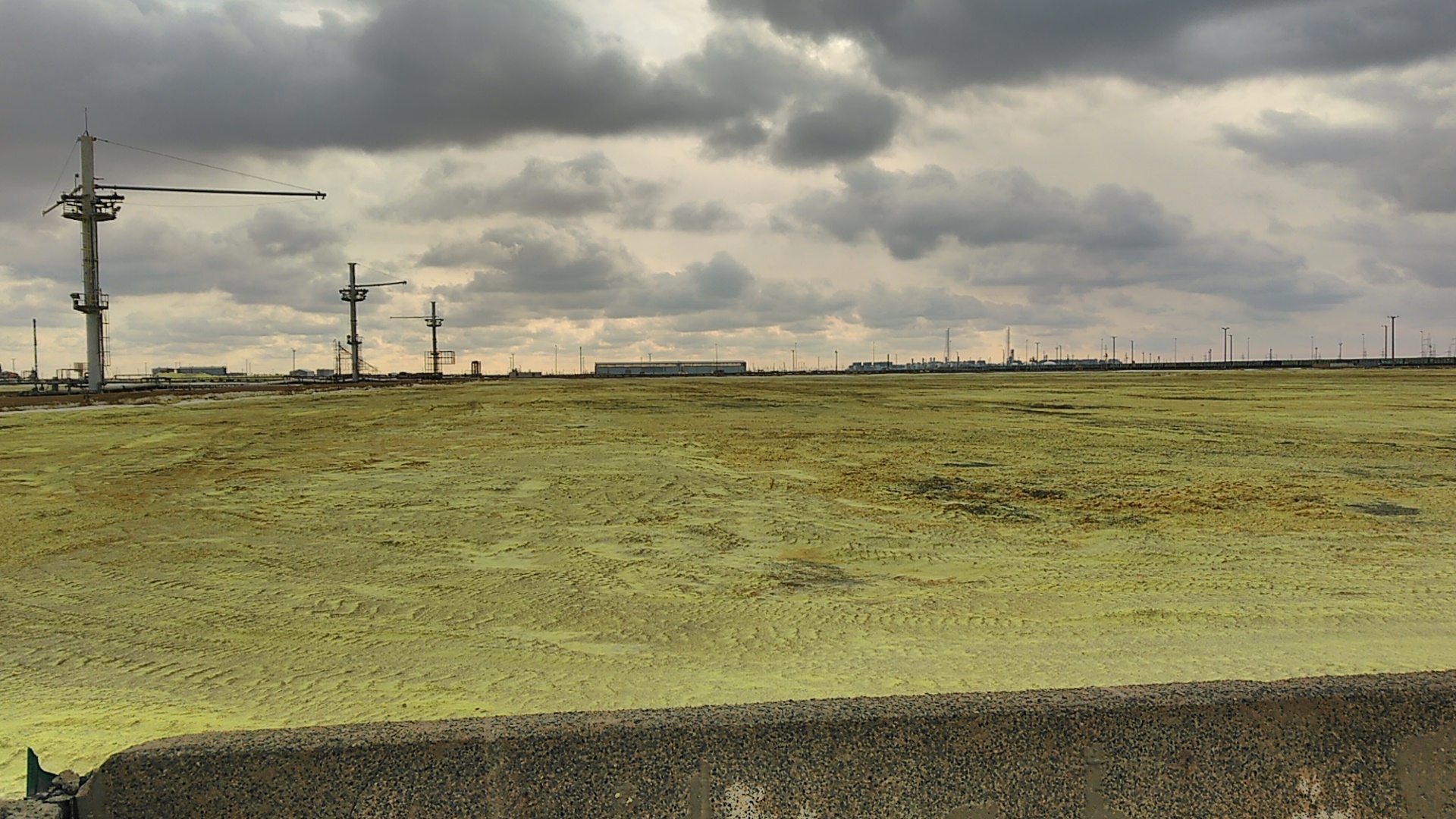 После этого участники визита осмотрели серные карты №6, 7, 8 и 9. Площадь серных карт составляет от 30 до 130 тысяч квадратных метров. Специалисты пояснили, что серные карты имеют многоуровневую защитную конструкцию. В основании площадок для хранения серы уложен слой хорошо перемешанного гравия. Слой гравия подстилает 800 мм слой песка, между слоями песка и гравия укладывается слой геотекстиля, который увеличивает устойчивость отсыпаемой подушки и предотвращает перемешивание песка и гравия. По периметру площадок устроено железобетонное ограждение высотой. Зазор между ограждением и складированной серой составляет около 4 м. Сопряжение между ограждением и складированной серой усилено покрытием из высокоплотного полиэтилена, обеспечивая тем самым дополнительную защиту грунтовых вод от просачивания дождевых стоков сквозь основание. Отдельно было отмечено, что в течение последних двух лет налив серы на карты не производился. Остатки серы на серной карте №9 постепенно реализуются. В настоящее время объект не используется в производственном режиме с перспективой последующего восстановления и повторного использования территории.