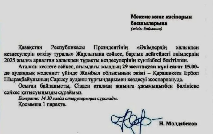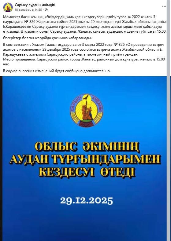 «Встреча акима Жамбылской области Ербола Карашукеева с жителями Сарысуского района и его личный приём были организованы в соответствии с требованиями Указа Президента Республики Казахстан от 3 марта 2022 года № 826. Информация о месте и времени встречи была опубликована на официальных интернет-ресурсах районного акимата 18 декабря 2025 года», — сообщили в акимате.