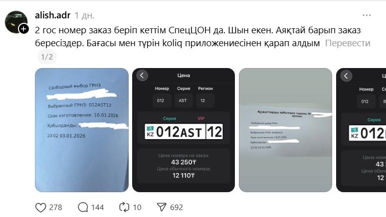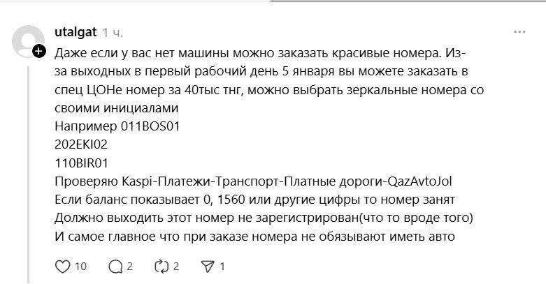 Как пишут казахстанцы, заказать номер можно даже при отсутствии автомобиля. По их словам, за сумму около 40 тысяч тенге возможно выбрать зеркальные комбинации или номера с инициалами — например, 011BOS01, 202EKI02, 110BIR01 и другие.