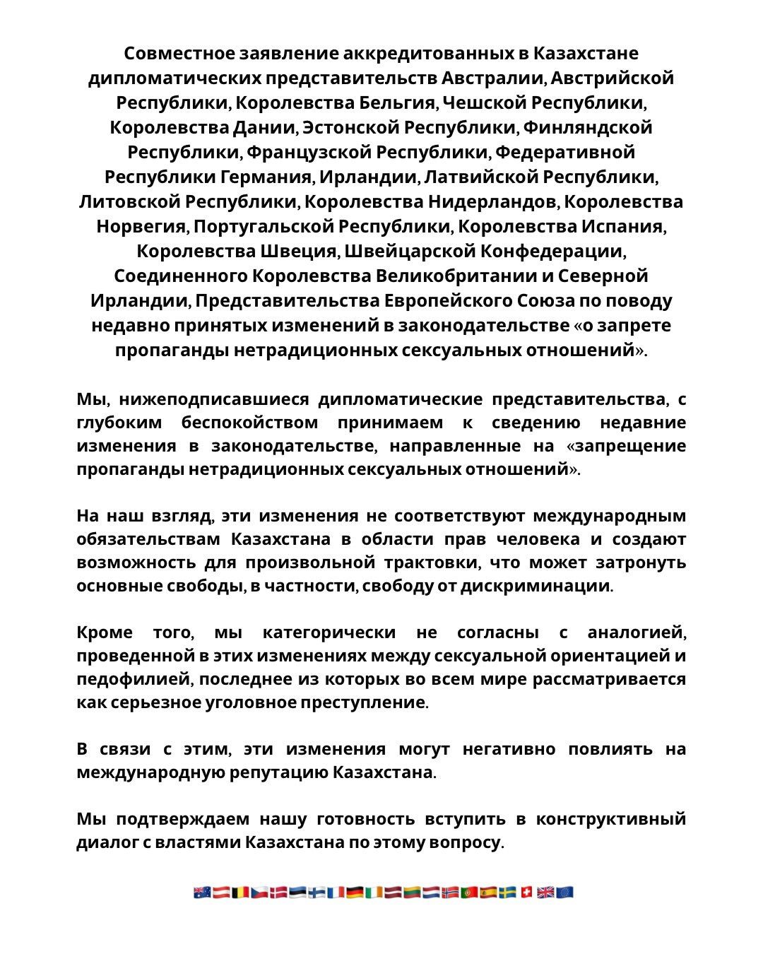 В документе отмечается, что дипломаты «с глубоким беспокойством» восприняли недавние изменения в законодательстве. По их оценке, новые нормы не соответствуют международным обязательствам Казахстана в сфере прав человека и могут привести к произвольной трактовке, затрагивающей основные свободы, в том числе свободу от дискриминации.
