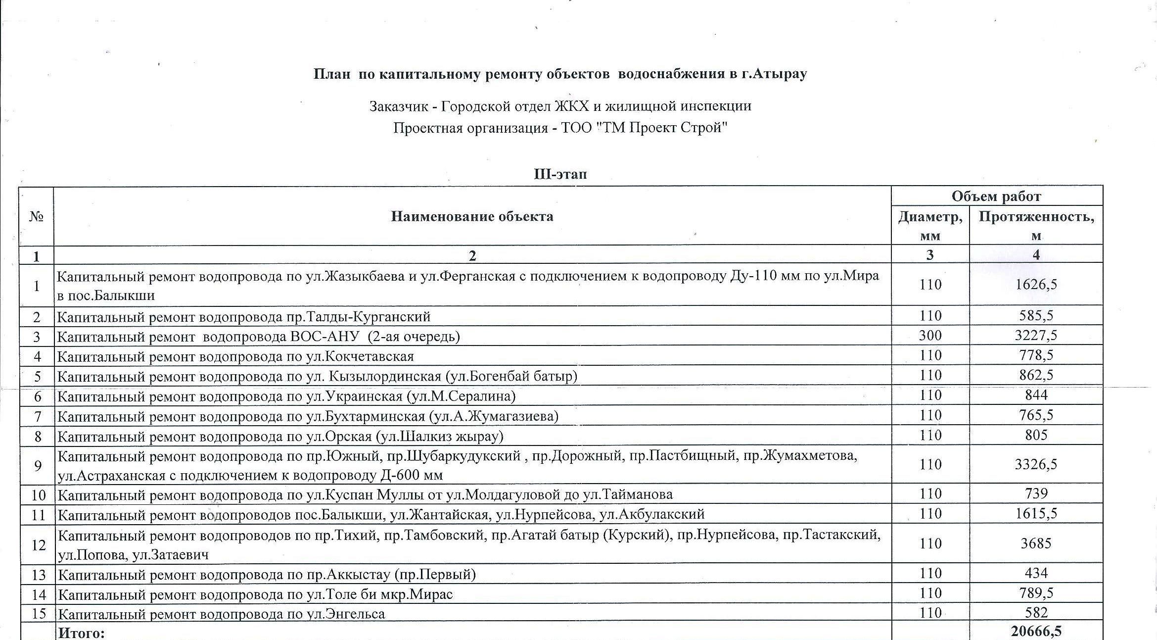 Работы по первому и второму этапам выиграла компания «Сапа құрылыс», третий – компания «Агидель-Ас». В 2024 году был выполнен определенный объем во 2 и 3 мкр. Авангарда, в Балыкши, заменили 7,5 км на улицах Кулманова и Тайманова. Но в прошлом году подрядчики почти не работали.