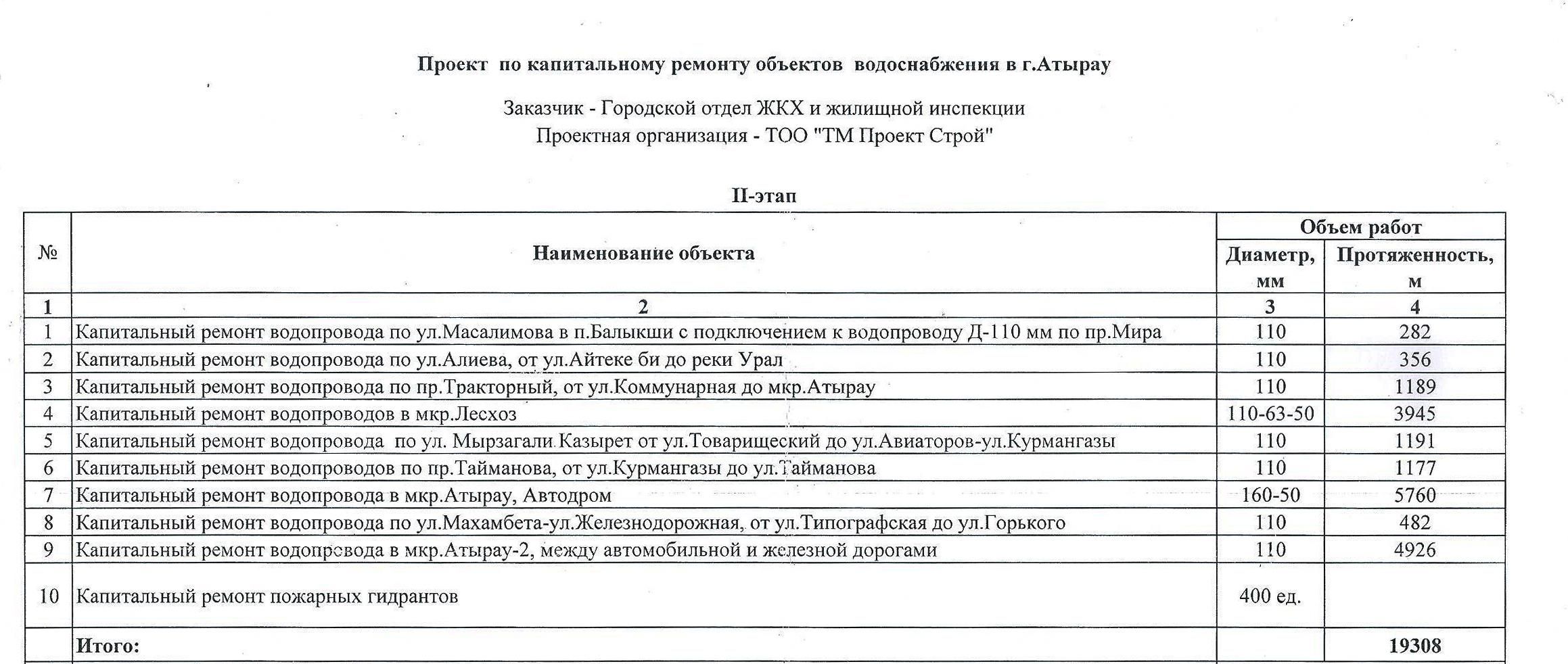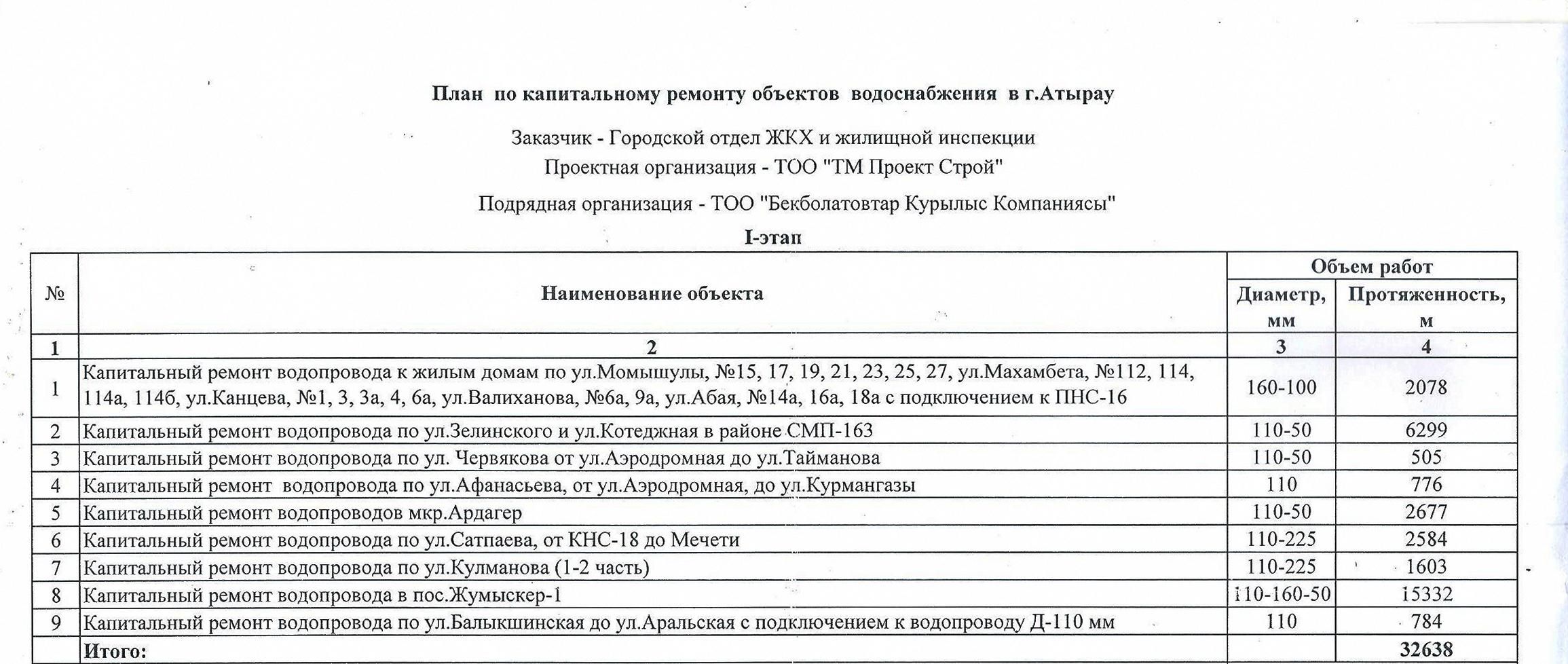 – Первый этап, стоимостью в 2,8 млрд тенге, полностью завершен, все указанные районы подключены к новым пластиковым водопроводным линиям вместо старых металлических. Сумма работ второго этапа составила 1,7 млрд тенге, здесь выполнено шесть позиций из десяти. А реализация третьего этапа, стоимостью в 2,2 миллиарда, начнется и завершится в этом году. Подрядчик – ТОО «Бекболатовтар курылыс компаниясы».