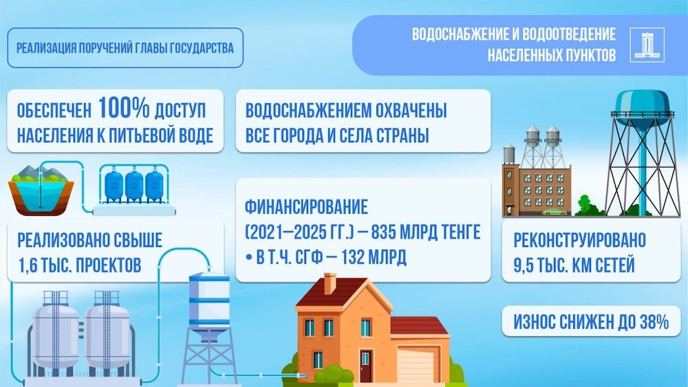 На заседании правительства по вопросам водоснабжения и водоотведения населенных пунктов вице-министр промышленности и строительства Куандык Кажкенов доложил о полном исполнении поручения главы государства по обеспечению населения доступом к питьевой воде до конца 2025 года.